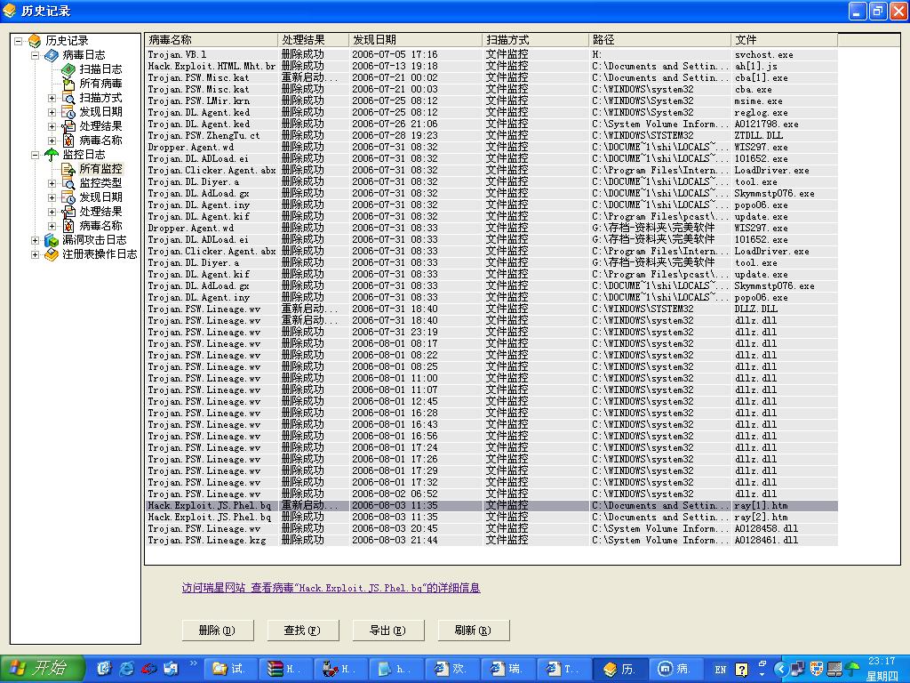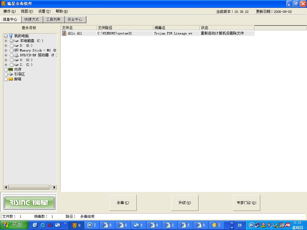 1、启动window XP sp2系统,自动关闭瑞星监控功能;用瑞星杀毒软件2006杀毒,提示:文件名:dllz.dll;文件路径:c:\windows\system32; 病毒名:Trojan.PSW.Lineage.wv;状态:重新启动计算机后删除文件。