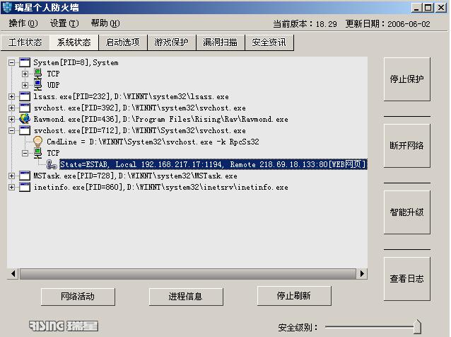 附:问题时刻,瑞星防火墙显示:进程“svchost”链接的一个IP地址