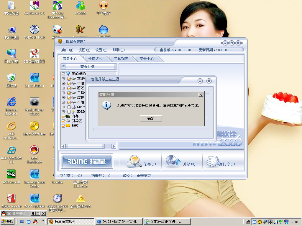 版主,您好!最近我的瑞星2006不能升级了,病毒库停留在7月31日,每次点击升级,都提示:“无法链接到瑞星服务器,请您在其他时间段尝试。”这是什么原因?怎么解决?不会是病毒引起的吧?
