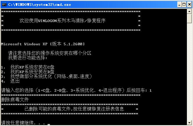 将进程结束后,运行WINLOGON.bat(需要事先下载下来,建议直接放在桌面上,以免打开我的电脑时再次激活病毒),按照提示操作即可。依次进行的是去掉文件s  r  h属性,删除文件,修复注册表信息。在后面提供了风乱舞的系统优化功能,可以根据个人喜好选择是否优化。