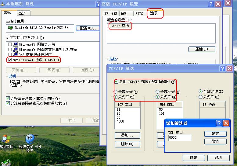 轻松地通过系统自身的“Internet协议(TCP/IP)”功能管理这些端口,对于个人用户来说,您可以限制所有的端口,因为您根本不必让您的机器对外提供任何服务;而对于对外提供网络服务的服务器,我们需把必须利用的端口(比如WWW端口80、FTP端口21、邮件服务端口25、110等)开放,其他的端口则全部关闭。这里,对于采用Windows2000或者WindowsXP的用户来说,不需要安装任何其他软件,可以利用“TCP/IP筛选”功能限制服务器的端口。具体设置如下:1、右键点击“网上邻居”,选择“属性”,然后双击“本地连接”(如果是拨号上网用户,选择“我的连接”图标),弹出“本地连接状态”对话框。2、点击[属性]按钮,弹出“本地连接属性”,选择“此连接使用下列项目”中的“Internet协议(TCP/IP)”,然后点击[属性]按钮。3、在弹出的“Internet协议(TCP/IP)”对话框中点击[高级]按钮。在弹出的“高级TCP/IP设置”中,选择“选项”标签,选中“TCP/IP筛选”,然后点击[属性]按钮。4、在弹出的“TCP/IP筛选”对话框里选择“启用TCP/IP筛选”的复选框,然后把左边“TCP端口”上的“只允许”选上。这样,您就可以来自己添加或删除您的TCP或UDP或IP的各种端口了。添加或者删除完毕,重新启动机器以后,您的服务器就被保护起来了。如果只上网浏览的话,可以不添加任何端口。但是要利用一些网络联络工具,比如OICQ的话,就要把“4000”这个端口打开,同理,如果发现某个常用的网络工具不能起作用的时候,请搞清它在您主机所开的端口,然后在“TCP/IP筛选”中添加端口即可。