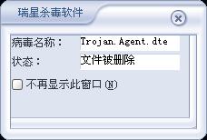 有没有之人知道怎么杀啊,我的瑞星已经更新到最新版本了,杀了几次都不行,找都找不到,可是监控中心总是跳出“发现Trojan.Agent.dte病毒,文件被删除”,怎么办啊,我的是正版的瑞星阿