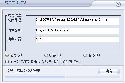 这个病毒大概有3天的时间了。.当时查出来杀了之后,过不了一分钟马上出现瑞星的监控提示说有病毒,我当然是马上杀毒.奇怪的是竟然是2个病毒,这个杀了马上再出现一个.之后隔一分钟,2个毒又是同时出现..恐怖的是第2个出现的病毒.名字一直在改变.