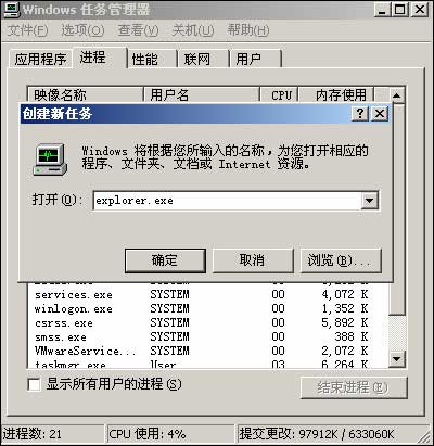 “Explore.exe”进程被结束后将会看不到桌面图标和任务栏,这时按住Ctrl+Alt+Del键,启动任务管理器,点击菜单“文件”-》“新建任务(运行…)”,输入“explorer.exe”,点击“确定”。