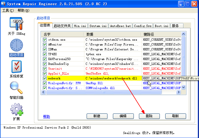 说明:先在控制面板的添加/删除程序中找到并卸载webwork,如果卸载不净,再考虑以下方法手工清除。这是个“极品”流氓。比较难对付。