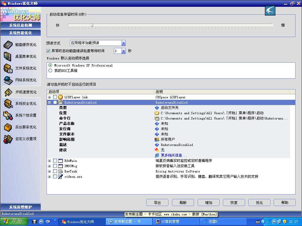 现在我每次开机都会自动打开一个叫“RsAutorunsDisabled”的文件夹,用windows优化大师可以查到,但是删不掉,总是说不存在。另外在system32文件夹里我发现了混合杀手(Worm.Win32.Gaobot.C)的文件scvhost.exe,被我删了,但是还是有开机时不启动瑞星杀毒软件和防火墙的情况,即使我用修复功能重装了,但是不到两分钟又自动退出了。而在安全模式下,用刚升级完的瑞星根本查不到病毒,再就是只要我打开浏览器,无论是IE还是Maxthon,很快任务栏就像死掉一样,怎么点都不好使,其它窗口速度奇慢,但仍可以点击,此时CPU的占用率一直是100%,我对症查了一下,我至少中了混合杀手和灰鸽子,请问谁能帮我解决这个问题,告诉我还中了什么病毒,怎么杀,或是能提供混合杀手的专杀器,我不胜感激!!!