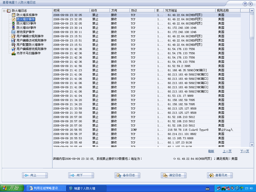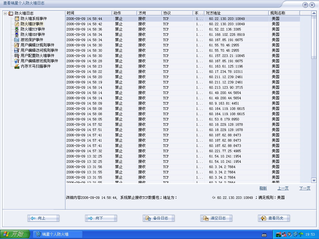 大家先看图片[img][/img],全都是美国的ID(不信的话,你可以去查),光今天一天瑞星的防火墙就拦截了不下50次,(图只是一小部分)前几天我用最新版的瑞星杀毒并未发现有毒,并用瑞星的漏洞扫描下载和修复系统安全漏洞,并添加IP规则拒绝了所有60.0.0.0~~~~~69.255.255.255地址的数据包(规则名称为美国,还有就是这个规则把好多国内的网络游戏也拒绝了,比如QQ堂,但是他反复变换ID,也先只有这么办了,),可是他这俩天越发强烈和频繁的攻击了,真怕他那天攻破,电脑里倒也没什么重要资料黑就黑了,大不了重装,只是有点气不过啊,而且自打他攻击,我的网速也相当慢啊,大家有什么好的方法啊!有血性的帮我顶顶,话说的有点严重,实在是有点气啊)
