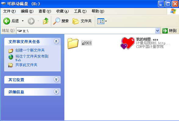 1、U盘插入感染此毒电脑的USB口后,U盘中出现下图中所示的文件(我的相册.exe)。