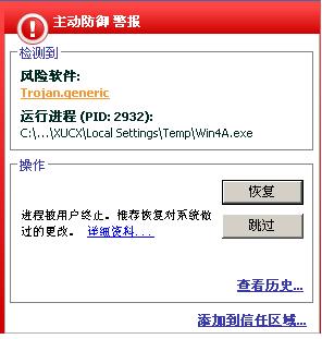 卡巴已经提示了一早上,一开始卡巴还有“删除”的项目,到后来就只有“恢复”和“跳过”了,这个病毒,从win3.exe一直在变,只要你按跳过,20秒不到就弹出下一个组合。晕倒了啊。。。