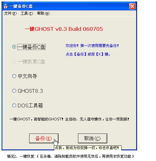 状态下,打开软件,备份c盘时,软件运行到一半,机器重其,进入选择状态,回车一键恢复,输入密码,在dos下进行备份。