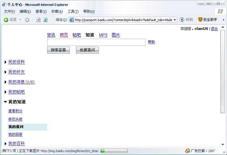 百度知道不能显示“完毕”;好象总有个图片不能加载完毕,而且看不到其中“我的提问”。