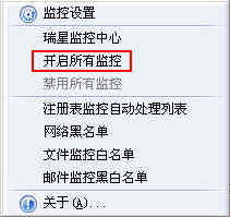 【解决方案1】:鼠标右键单击瑞星实时监控,选择【开启所有监控】,如图: