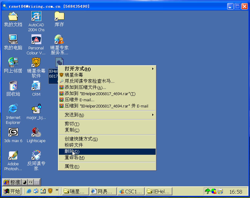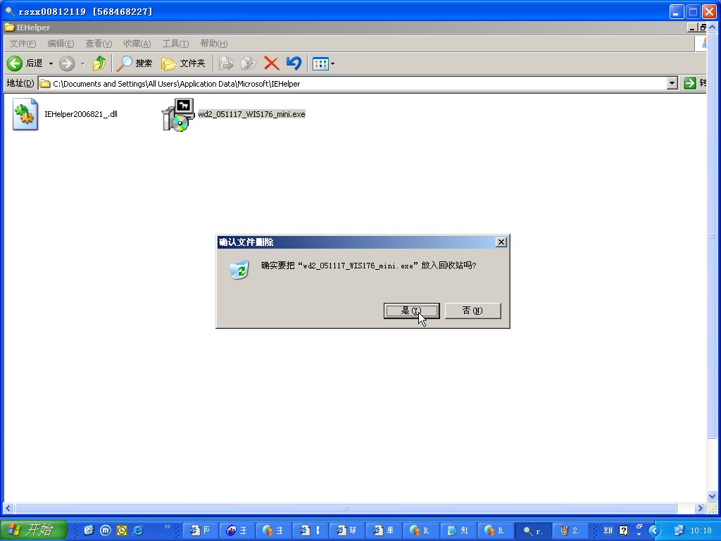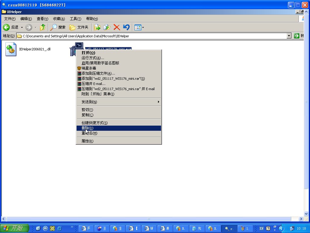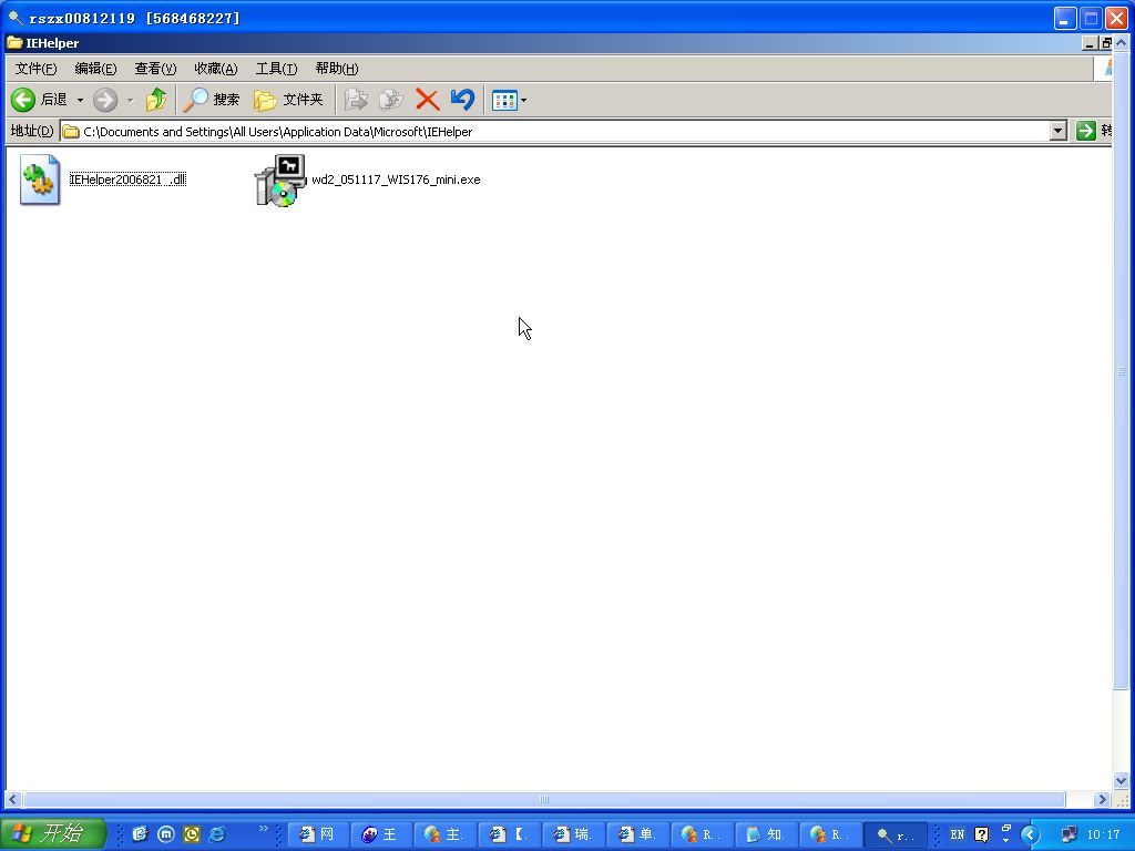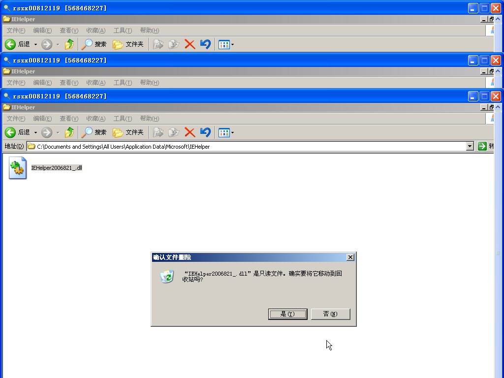症状:瑞星文件监控或主程序检测到Trojan.DL.Agent.apb,病毒文件路径C:\Document and Settings\All Users\Application Data\Microsoft\IEHelper\IEHelper*.dll(其中的*代表文件名变化的部分),状态为“重新启动计算机后删除”,但重启计算机后,病毒仍然存在。