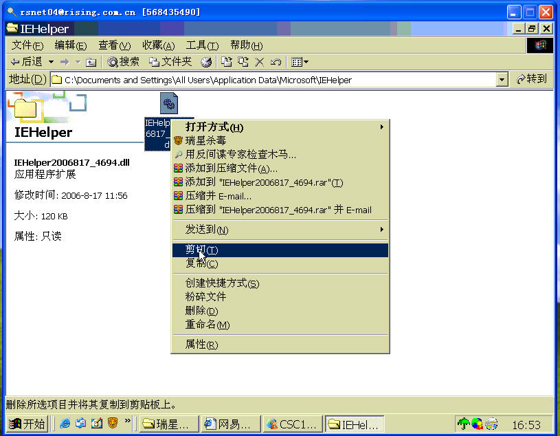 步骤1、把病毒文件IEHelper*.dll剪切到其他目录,下面以剪切到桌面为例