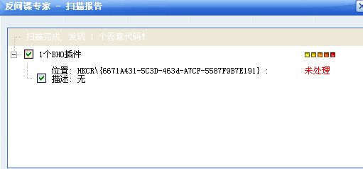 用反间谍专家查出一个BHO插件.按清除就程序没有响应.手动查找注册表也搜索不到.怎么才能清除这个?