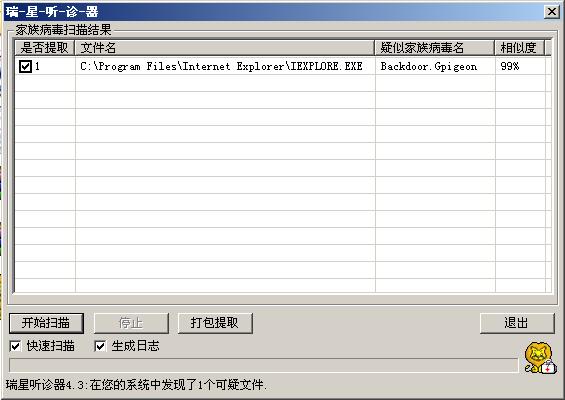 今天使用了卡巴斯基在线查毒扫描C:\Program Files\Internet Explorer文件夹,扫描到3个BACKDOOR.GPIGEON病毒分别在DOWN1到DOWN3三个文件里,后把这3个文件删除.(瑞星始终什么也查不到,最新18.45.42)