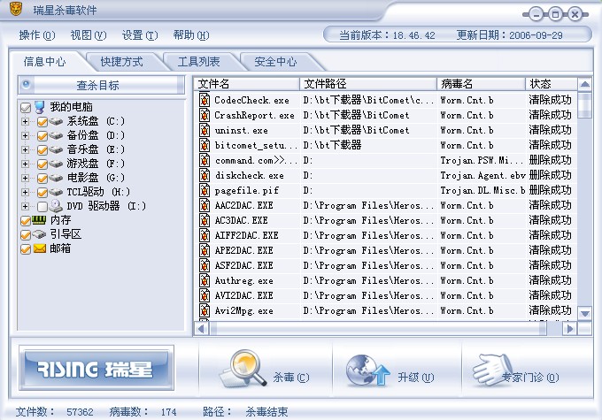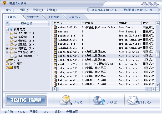 6楼上的大哥!你是不是帮我看错了呀!55电脑很卡不放心我在拿瑞星重新杀毒在D.E.F.G.H盘那里杀出了174个病毒!