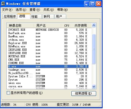 3、进程中还发现有进程名为6.exe的进程,中毒无疑,但就是杀不出任何病毒,安全模式下也一样,在线求助各高手解决.....下付扫描结果