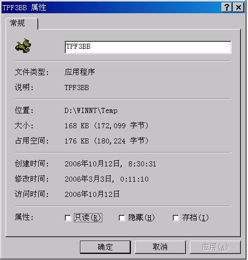 最近中了一种病毒,它会在我的系统盘下的winnt/temp下自动生成一个文件名六位长度,包含数字和字母的可执行文件,如tpf3bb,长度只有160几个字节。据我观察,这个文件名应该是随机生成的。在进程中可以发现该执行文件,而且无法终止,我使用了PowerRmv这个可以杀灭文件的工具将其杀死,然后会发现在同一目录下生成同名的空文件夹。再次启动后,又会在同一位置生成新的可执行文件,当然文件名不同了。利用网络搜索,没有发现有关该病毒的帖子,当然不排除我找的不仔细。该文件的图标都是一个奔跑中的褐色小狗。我用趋势杀毒扫描以及ewido扫描都没有把它扫出来。唯一有问题的地方的就是在读移动硬盘的时候,无法识别卷标,会自动指定到什么tmp0.1st.exe之类的东西,还让我选择打开程序,当然右键打开就没事了,当然这也可能是我中了其他病毒。请教高手,这是个什么东西?怎么杀死他?
