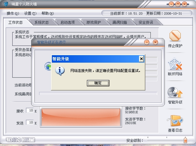 更绝的你还没见过。隐藏文件不让显示,瑞星监控自动退出,手动打开后发现监控项全关。瑞星不让打开,不让装,不让删,不让升级,所有瑞星工具打不开。天网防火墙自动退出,也打不开。到瑞星网站在线查毒,刚查出几个病毒就自动重启。安全模式下打开瑞星杀毒,结果里面没有盘让你杀。启动项全关,开机又有。倒了。