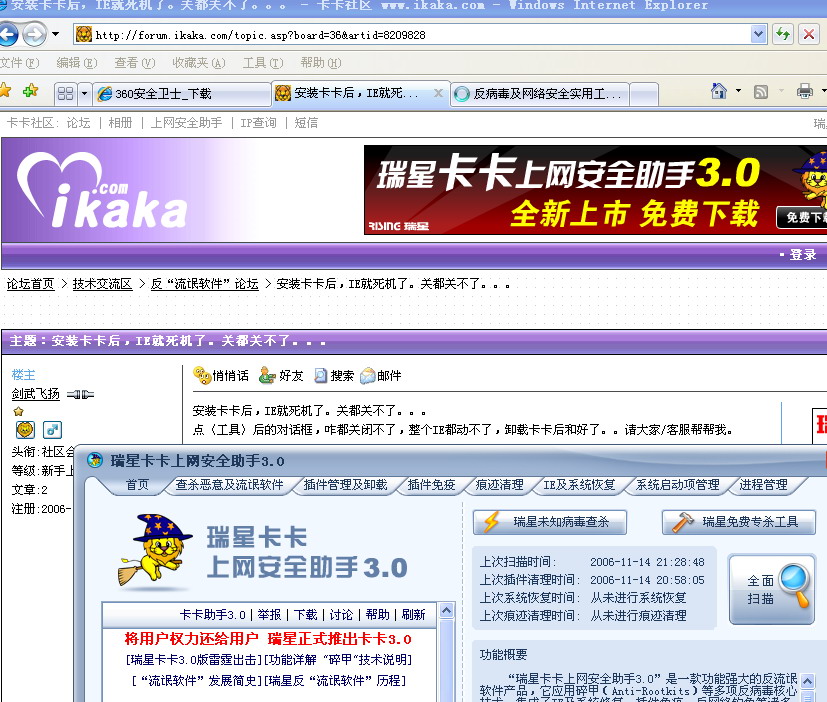 点〈工具〉后的对话框,咋都关闭不了,整个IE都动不了,卸载卡卡后和好了。。请大家/客服帮帮我。