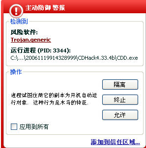 运行CDD.exe时,卡巴主动防御报风险软件,如果选择允许后再用卡巴查杀却不能发现。