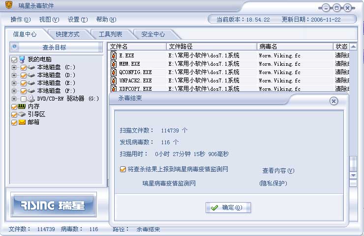 昨天晚上关机前我用瑞星最新板查了一下毒当时查到一个viking病毒,瑞星报已经杀掉,于是我就放心的关机了,今天我开机后又查了一下病毒,结果如下图。瑞星就好象女人的处女膜一但被戳破以后,后面你再想修也难修的起来了,viking的专杀我在瑞星网站上下的,本身就是病毒。我从2000年到现在一直用的瑞星正板,我一年买一套,没有想到这几天我电脑时几年的东西全都没有了,刚才我又找了一个人来帮我看电脑,他说要重新分区,重装系统。郁闷