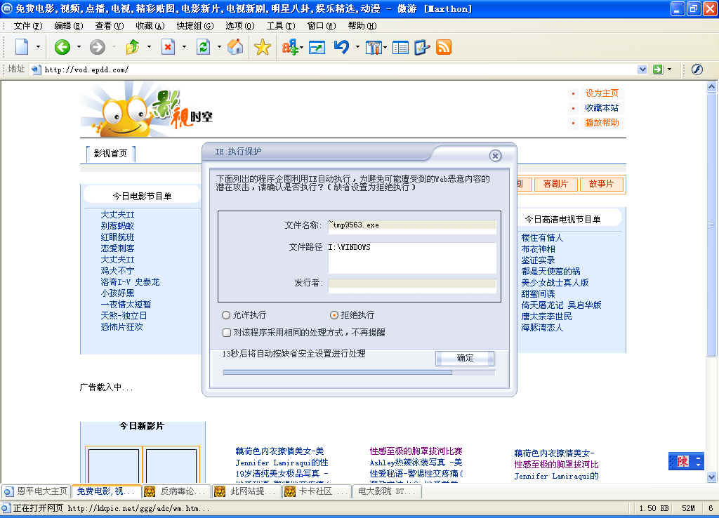 本人加入站长内容联盟,vod.epdd.com 但发现,他们提供的内容总是带一线毒,和他们的站长联系,经过和他们的多次交流,他们认为是瑞星软件的问题。晕,我本人经过多次测试,认为是他们的服务器被人挂了毒,希望朋友们能证明一下是瑞星的问题还是他们服务器的问题!注意,此网站提供的内容不是说天天有,一天内有时有,有时没有!麻烦大家注意以下,特别是瑞星的技术人员注意,别让他们说是你们的产品有问题!