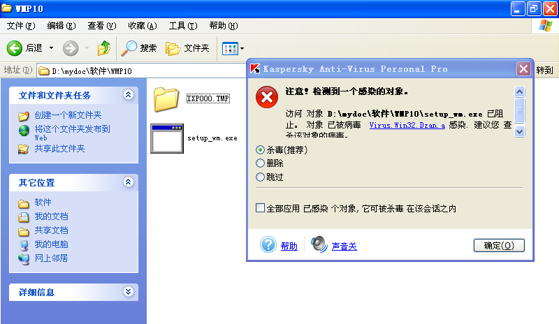 7、卡巴斯基今天的病毒库虽然查不到\SYSTEM32\COM\LSASS.EXE和\SYSTEM32\COM\SMSS.EXE;但能查到被其感染的.exe文件(图4)且可清除其中的病毒代码(图5)。