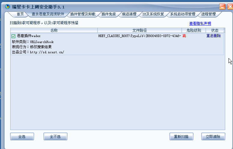 请斑竹帮忙看看,这个东西怎么杀,老是在我的机器上,电脑启动特别满,而且我按照要求重新启动了,可是一扫描就又出来了,这是什么病毒啊?