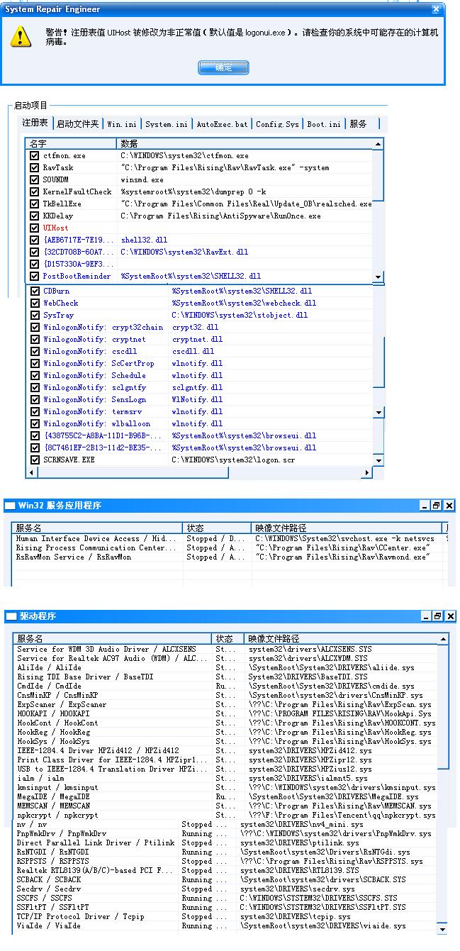 这样的报告,我想这一定是中了病毒吧,而且机子运行也很慢。所以提供SREng运行时的注册表项、Win32服务应用程序、驱动程序的图片