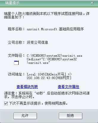 防火墙提示C:\WINDOWS\system32\usrinit.exe要访问网络,我拒绝了,是不是中毒了