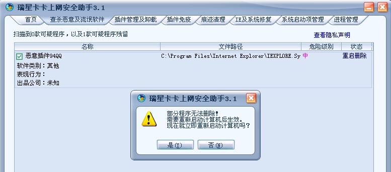 以下是病毒名为:IEXPLORE.Sy的插件,我虽已查出但是无法清除,电脑提示重启删除,但重启 N 遍了此插件依然存在