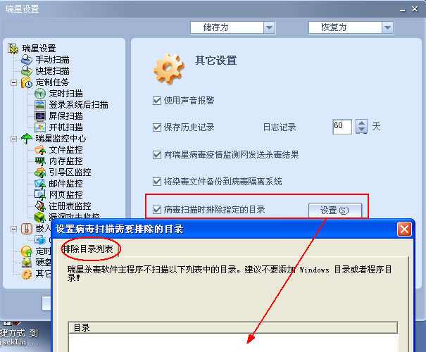 设置后还是不行,这样设置只能在手动扫描时排出该目录,但文件监控仍然要杀他