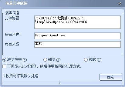 Dropper.Agent.evx              忽略        2006-12-16 00:12      文件监控            C:\DOCUME~1\尐震爺\LOCALS~1\Temp                                                                                        LiveUpdate.exe>>mian007