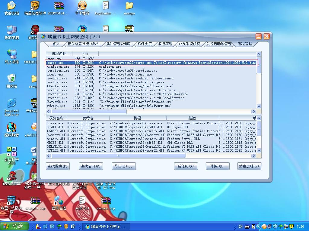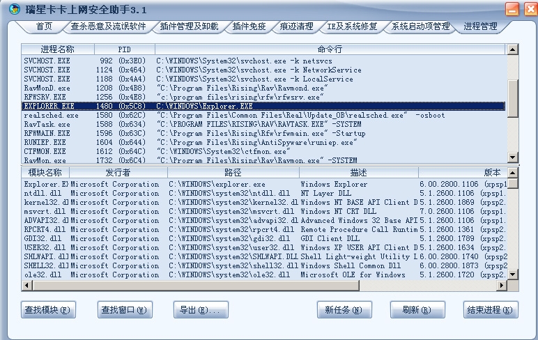 昨天晚上上班的时候突然想到的,不知有没有用。就是利用卡卡的进程管理察看模块,不知能否看出鸽子的痕迹