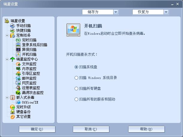 打开瑞星杀毒软件 设置 详细设置 定制任务里面把 使用开机扫描的钩钩上 然后切换到 开机扫描 选项卡 选中 扫描系统盘 然后确定 重启