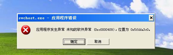 我遇一电脑,重装系统后一上网就出现一提示框,内容为"应用程序发生异常 求知的软件异常(0xc0000409),位置为0x5fdda3c0",标题为"svchost.exe - 应用程序错误",以前我都是等系统自己下载了系统补丁后,它就不再出现了,但现在由于海底光缆出事故的原因无法下载补丁,哪位高手能告知.国内的几个大的杀毒软件我都试过了,以前用江民的免费的防火墙也有时能解决.