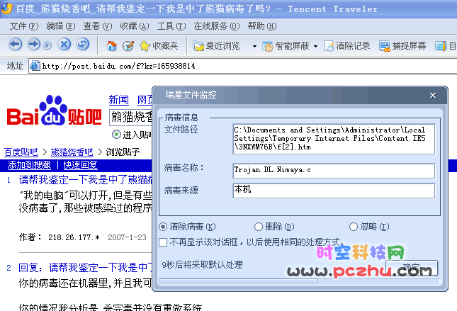 刚才无聊,就进百度贴吧,打上“熊猫烧香”看看大家都对这个病毒的说法,没想到刚进贴吧,瑞星监控就跳出来了。