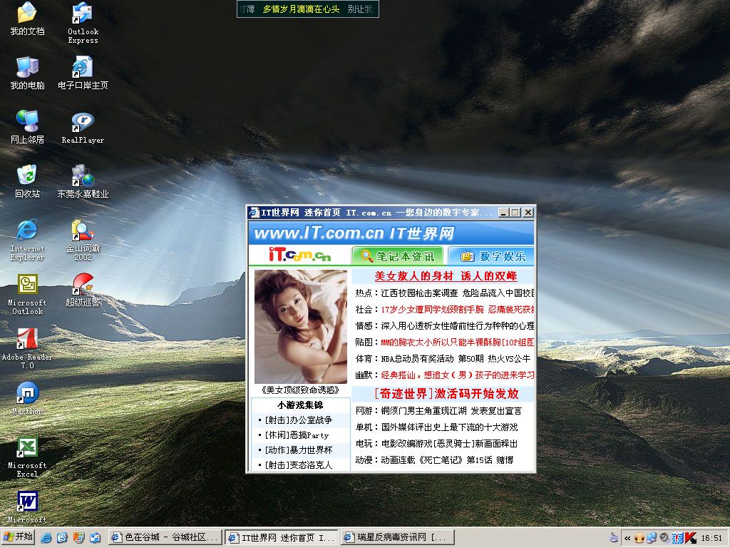 为什么我在登陆瑞星主页的时候会弹出一个小网页?开始我还没有注意,后来发现弹出的网页还是隐藏在最下面的,用鼠标根本拉不出来,还是用键盘拉上来的。不过杀毒软件没有提示有病毒.www.it.com.cn (IT世界网),还有我上铁血军事论坛的时候也会弹出来一个小网页。