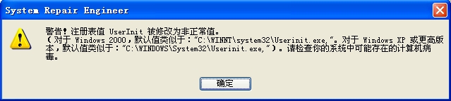 (对于Windows 2000,默认值类似于:"C:\WINNT\system32\Userinit.exe"。对于Windows XP或更高版本,默认值类似于:"C:\WINDOWS\system32\Userinit.exe"。请检查系统中可能存在的计算机病毒。