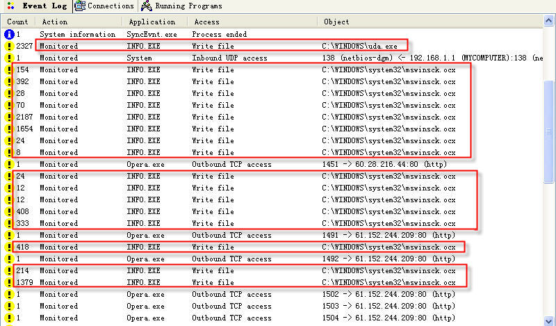 运行后,在%windows%下释放uda.exe;在system32\下释放mswinsck.ocx。
