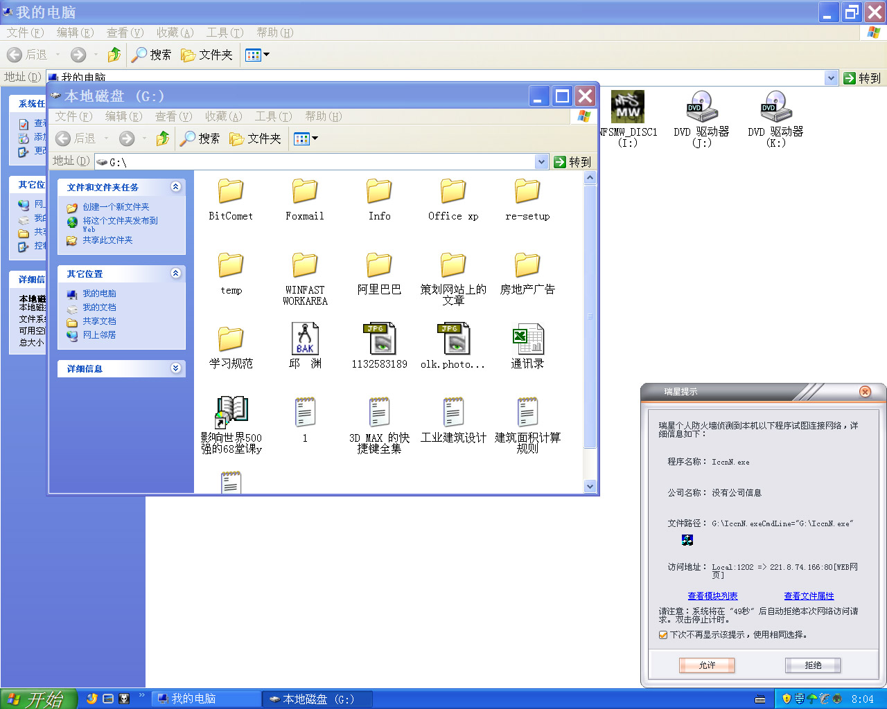 第一、我的系统是用GOHST备份的,以前每次还原都很正常,前两天电脑中了7只病毒后我把系统格式化后镜像回来,第一次启动进入D、E、F....盘的根目录都会出现下面的一个访问网络的对话框,不知这个IccnN.exe是什么毒,要怎么出理。以前都没有过,我镜像都是这种情况。