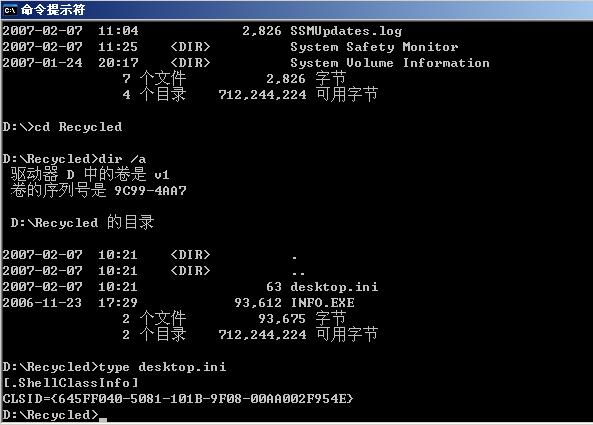 接下来一切都简单了,死病毒一个。删除生成的文件,还原注册表,关闭服务。如图。删除所有目录下的autorun.inf。接着删除INFO.EXE主体,也就是躲在回收站里的那个,可以这么看到。怎么删除就忘记了,记得以前在学校机房的时候就是这么藏游戏的,删除,想不起来了。。。