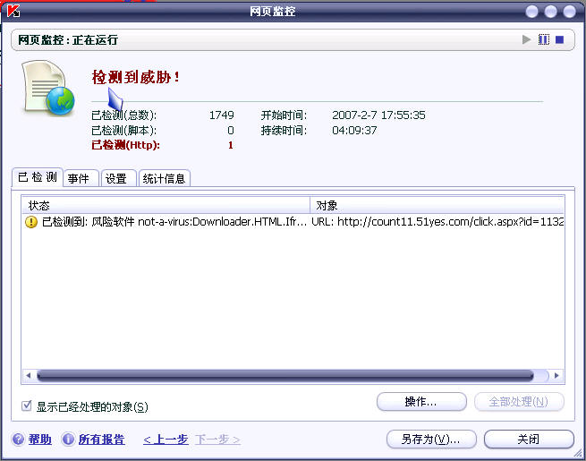 刚才无意点了个网站,卡巴报风险,网页上自动恶意下载,偶拒绝了还点了卡巴的跳过和隔离