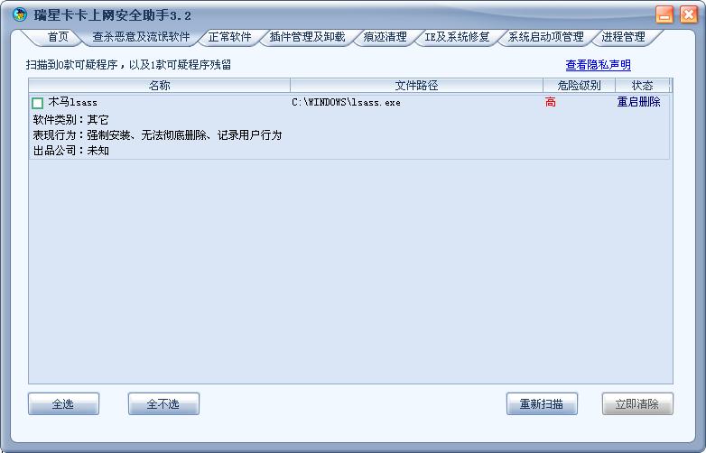 lsass.exe 是什么病毒? 为什么我安装得瑞星正版杀毒软件没有检测到病毒(最新病毒库),反到是kaka检测到了,郁闷。 重启无数次了,每次都杀不干净,特来求助