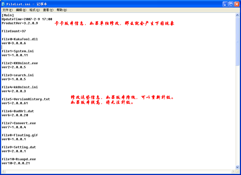 再说卡卡,问题更为严重,升级版本信息在FileList.ini里面,如果修改则可以重新升级,并且如果被修改为大数,那么也将无法升级