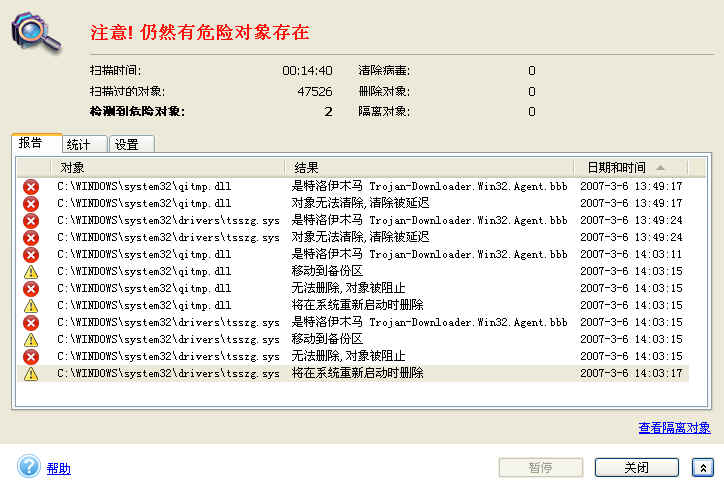 开机扫描发现Trojan-Downloader.Win32.Agent.bbb,无法清除,