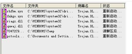 下面那图片就是我查杀出来的病毒,但是杀不了,提示是重启。